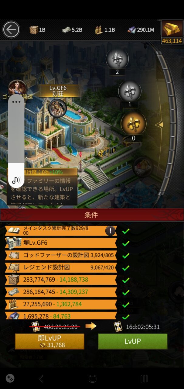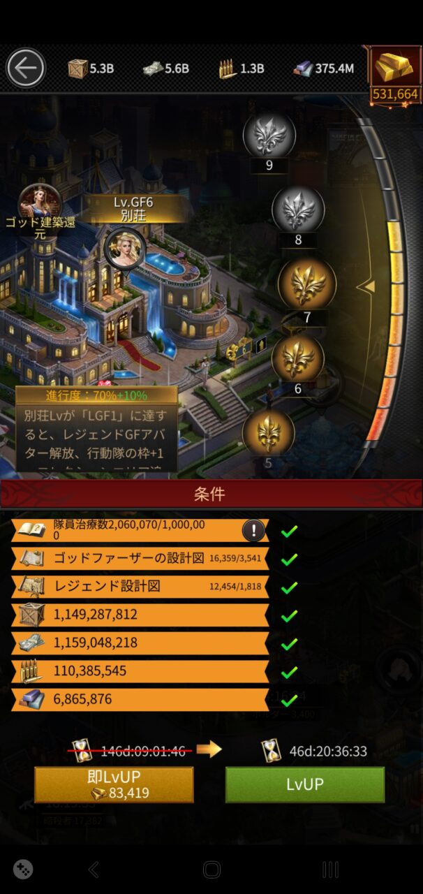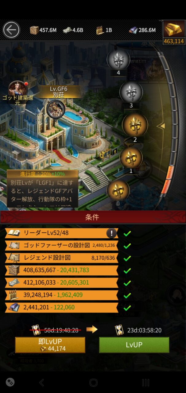 別荘レベルGF5からGF6に上げるためには、今までと違って、段階的に「進行度」という経験値を重ねていく必要があるよ。