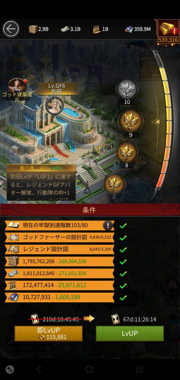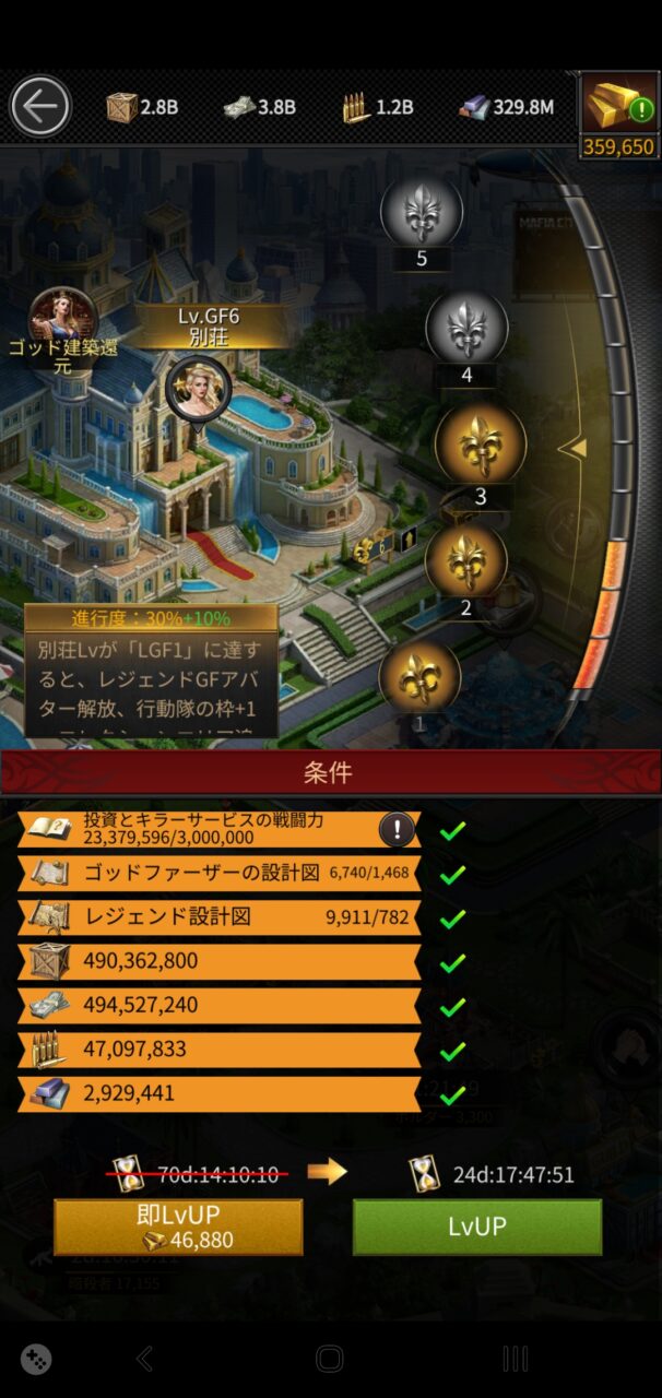 「マフィア・シティ-極道風雲」で別荘レベルアップを効率良くするために必要な資源とか条件とか時間を分かりやすく表にまとめてみたよ。使いまくろう!